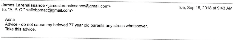 "Anna advice - do not cause my beloved 77 year old parents any stress whatsoever. Take this advice."